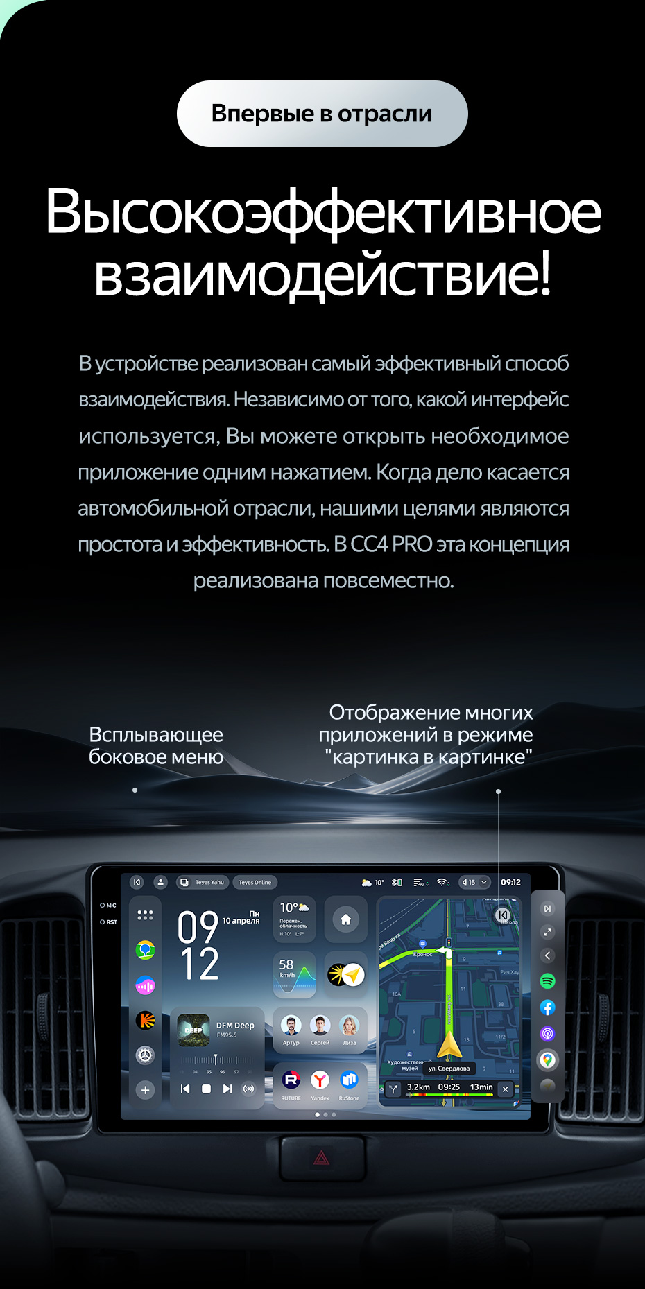 Teyes CC4 PRO - топовый флагман от Teyes, построенный на своей операционной системе Teyes OS в связке с искусственным интеллектом ChatGPT. Тут яркий 2К QLED дисплей, все виды аудиовыходов, гироскоп, приятный виброотклик, трехмерная тема главного меню, поддержка всех форматов звука и возможность подключения CarPlay и Android Auto.